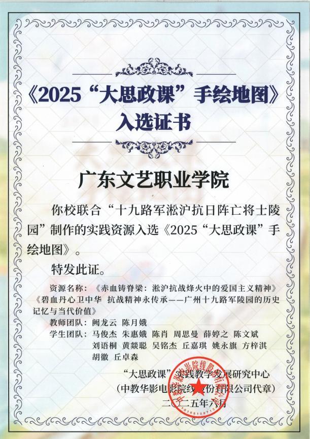近日,教育部“大思政课”实践教学数字地图项目成果——《2025“大思政课”手绘地图》正式发布。由广东文艺职业学院与全国爱国主义教育基地——广州市十九路军淞沪抗日阵亡将士陵园联合申报的教学资源《赤血铸脊梁:淞沪抗战烽火中的爱国主义精神》、学生实践成果《碧血丹心卫中华抗战精神永传承——广州十九路军陵园的历史记忆与当代价值》入选,并获颁荣誉证书。在此次评选中,广东文艺职业学院为广东省四所入选高校之一。